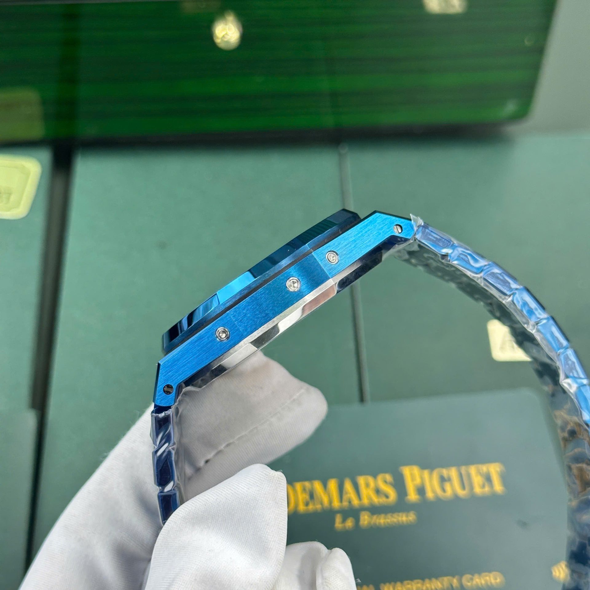 Vành bezel đặc trưng của dòng Royal Oak với hình bát giác và các ốc vít lộ thiên bằng chất liệu thép không gỉ, tạo nên điểm nhấn mạnh mẽ nhưng vẫn giữ được sự tinh tế. Phần dây đeo ceramic vừa vặn, thoải mái và bền bỉ, thích hợp cho cả sử dụng hàng ngày lẫn các sự kiện quan trọng.