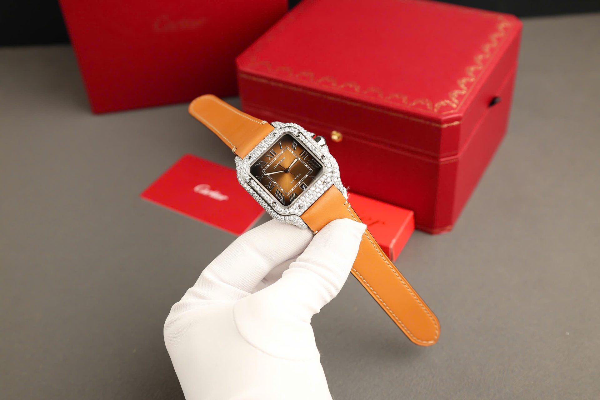 Đồng Hồ Cartier Santos Mặt Nâu Chế Tác Đính Kim Cương Moissanite Nhà Máy BV 39.8mm
