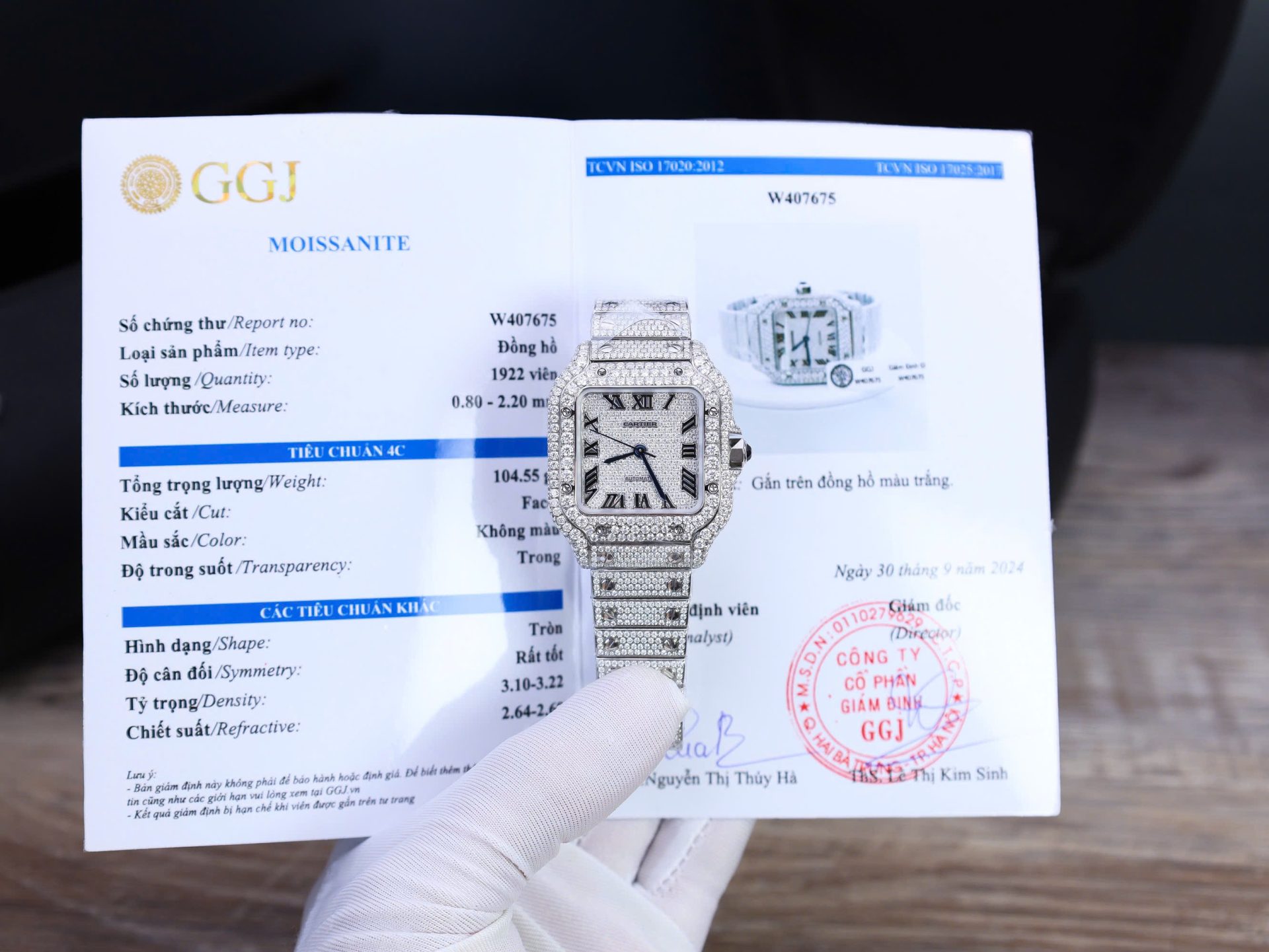 Đồng Hồ Chế Tác Cartier Santos Đính Full Kim Cương Moissanite Hong Kong là một sản phẩm đẳng cấp được chế tác tinh xảo tại nhà máy Hong Kong BV Factory tạo ra những sản phẩm hoàn hảo nhất. Đồng hồ chế tác kim cương Cartier với giấy tờ kiểm định rõ ràng của các đơn vị kiểm định uy tín.
