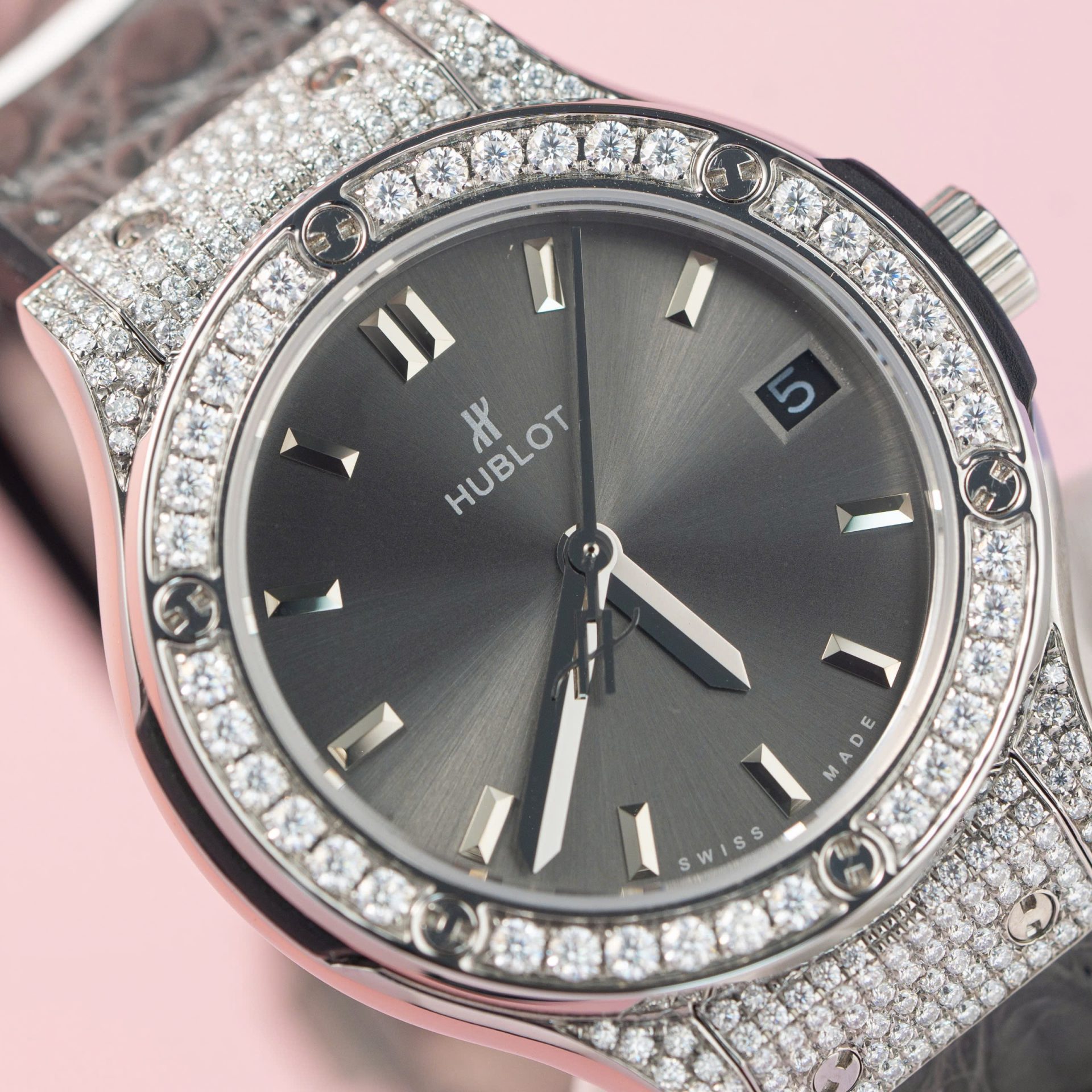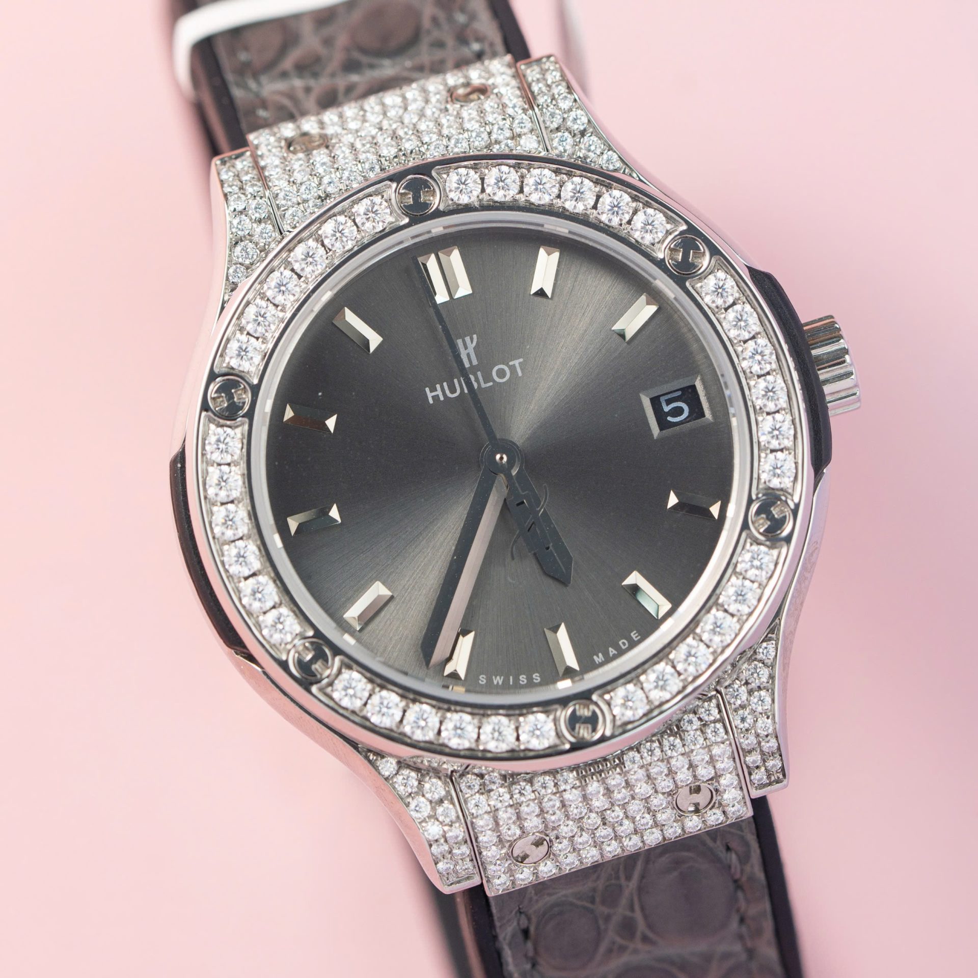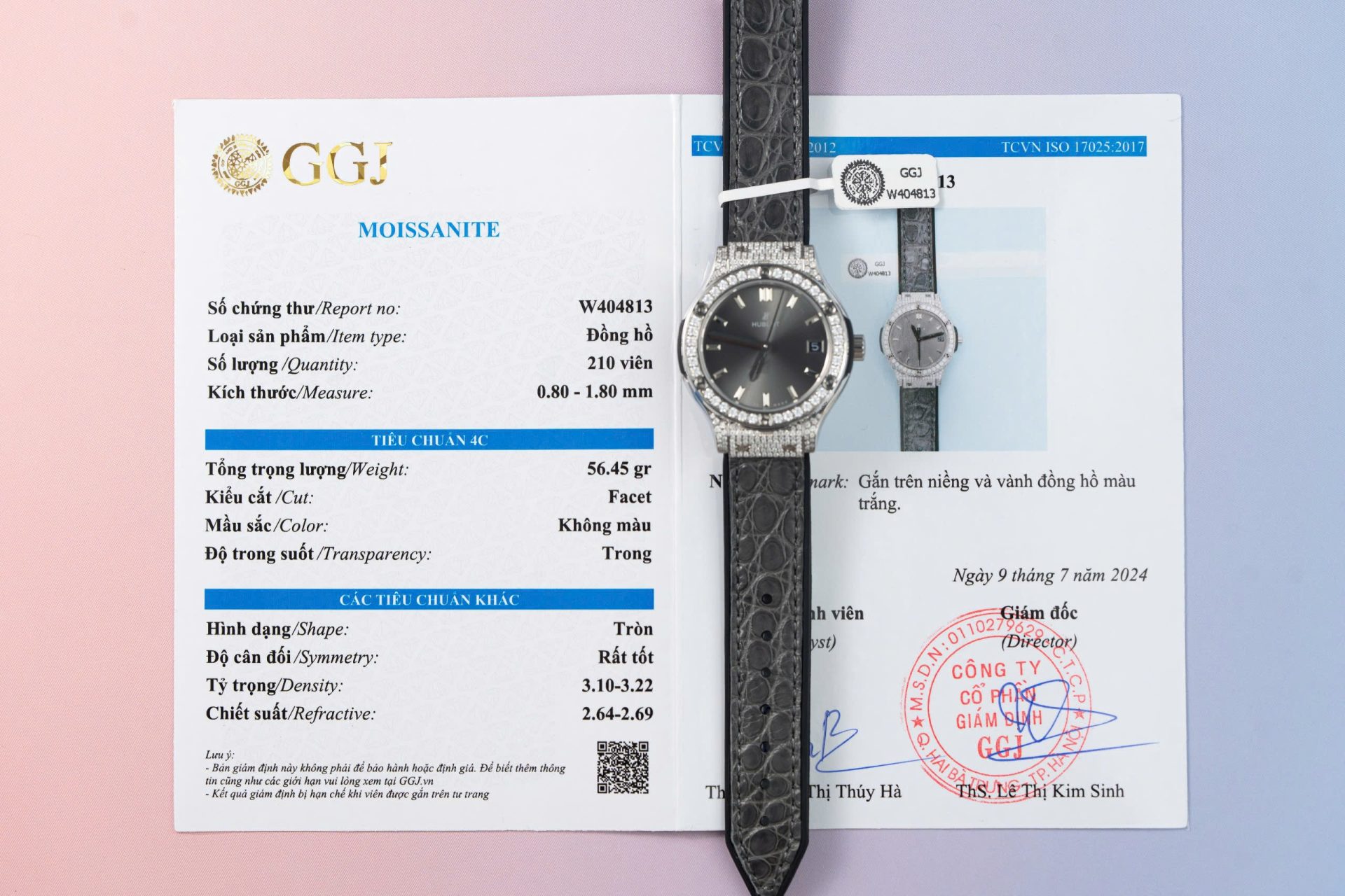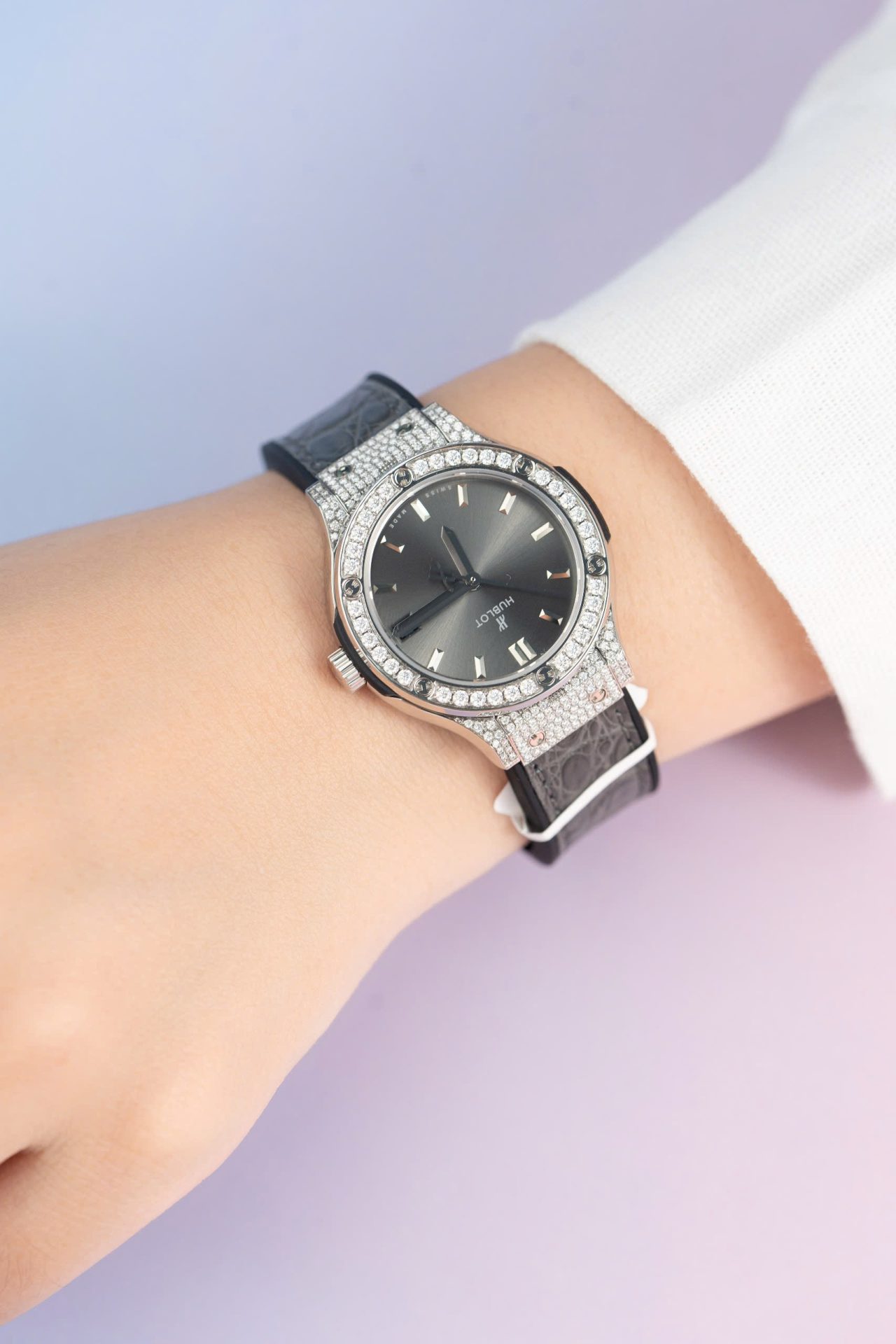Đồng Hồ Hublot Classic Fussion Đính Kim Cương Moissanite Hong Kong Nữ Mặt Màu Xám 33mm