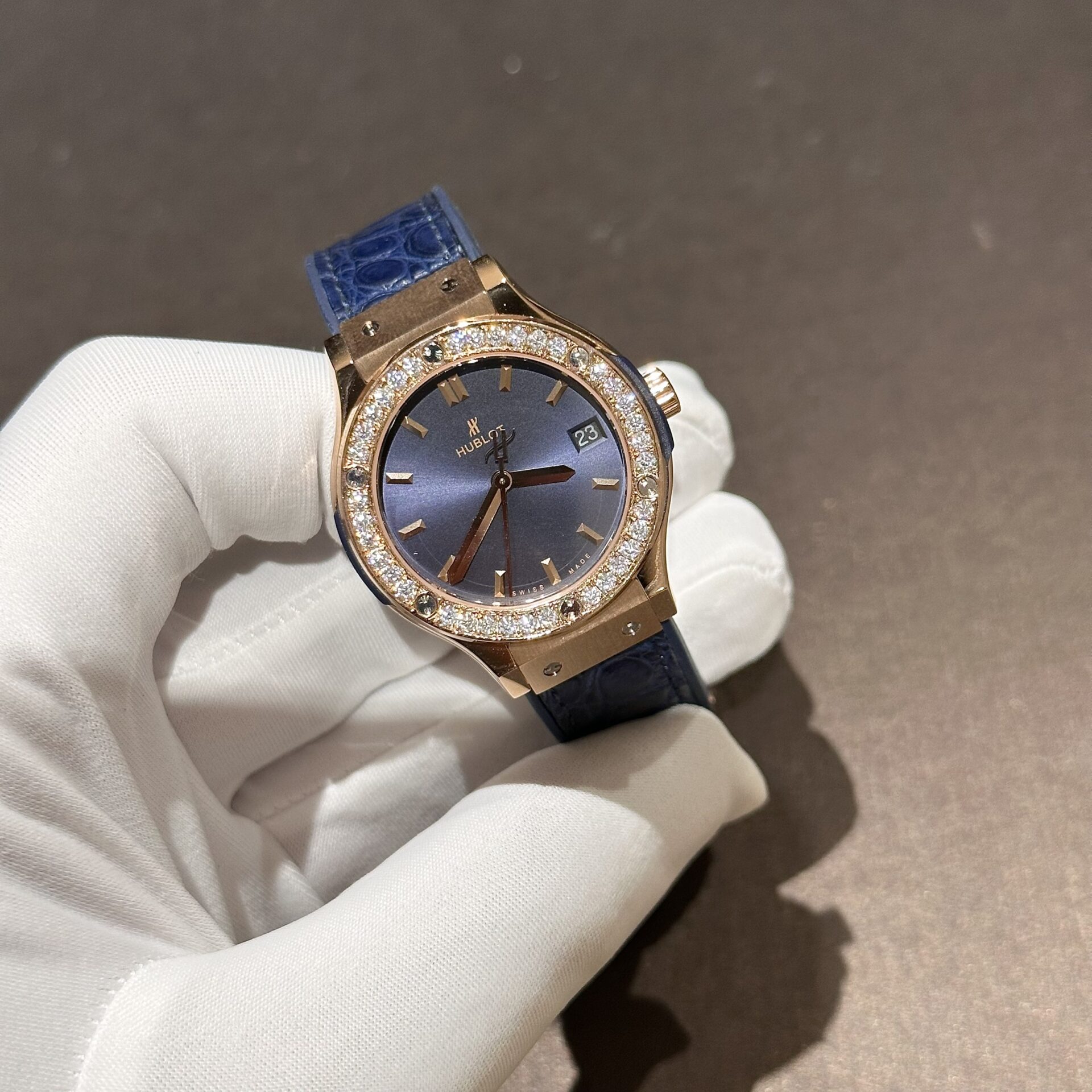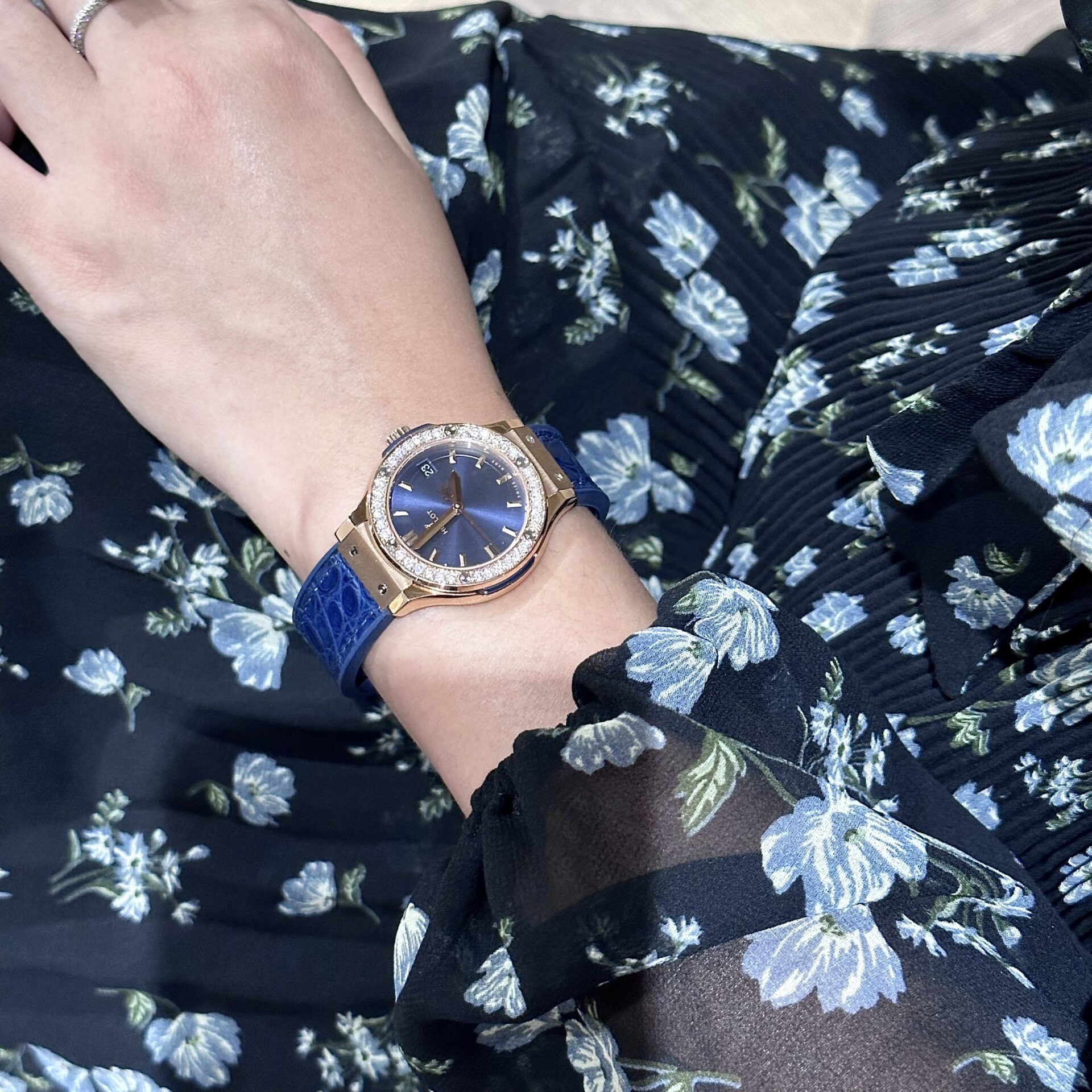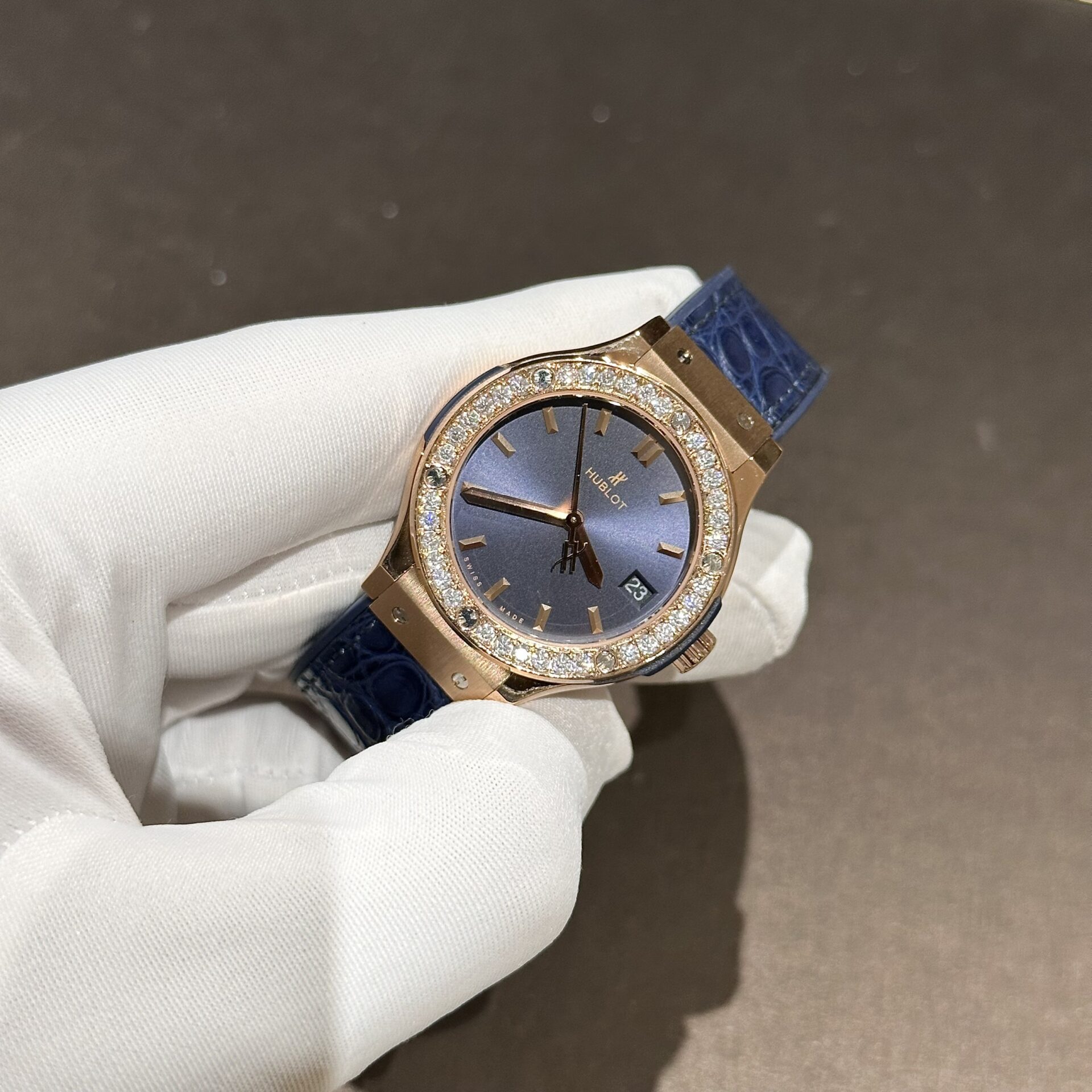 Đồng Hồ Hublot Nữ Đính Kim Cương Moissanite Màu Xanh Dương 33mm