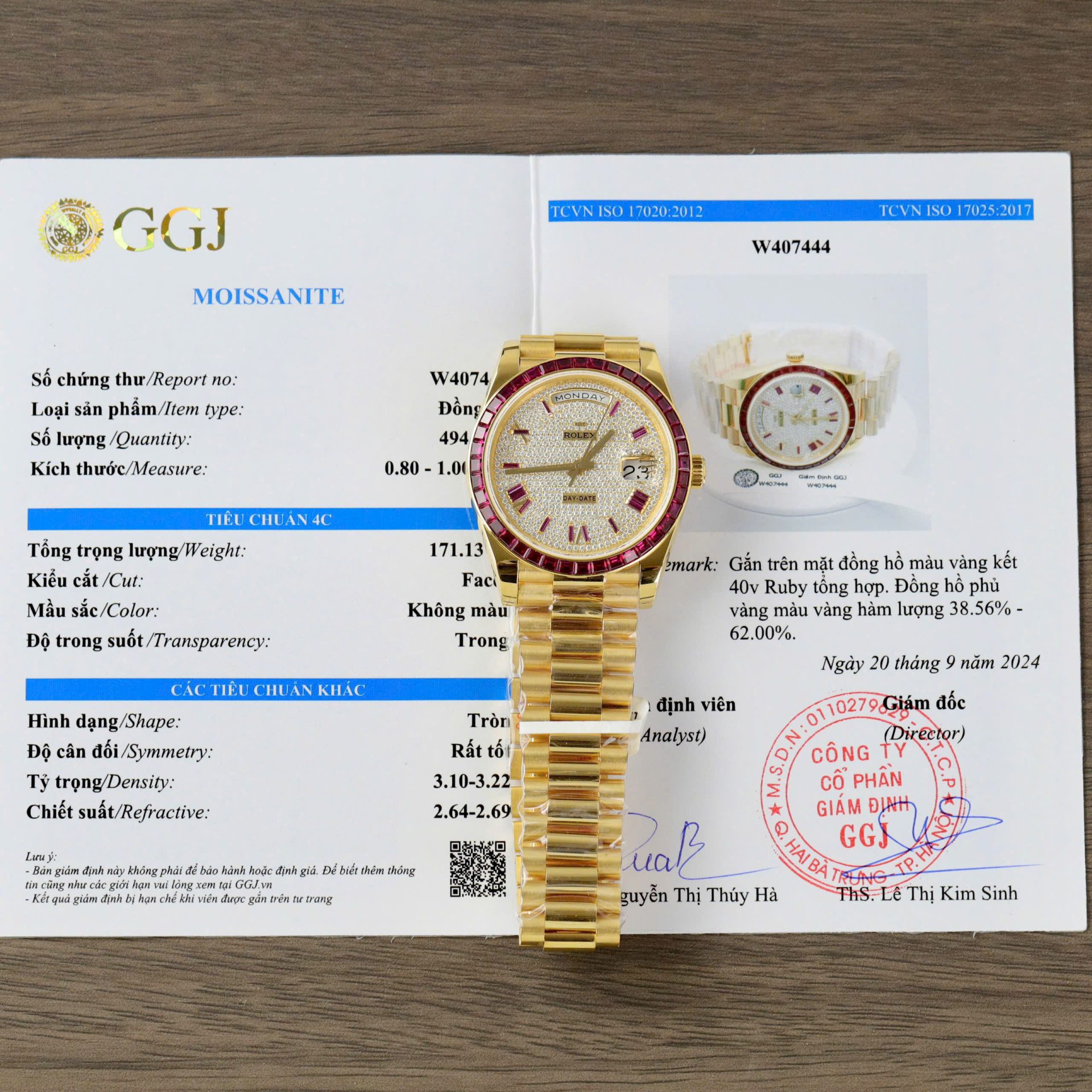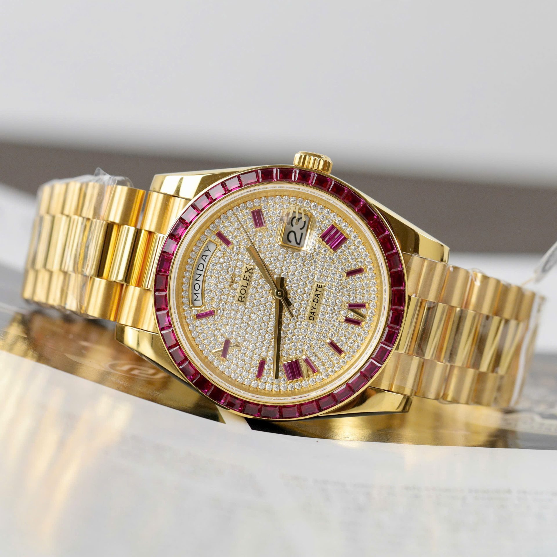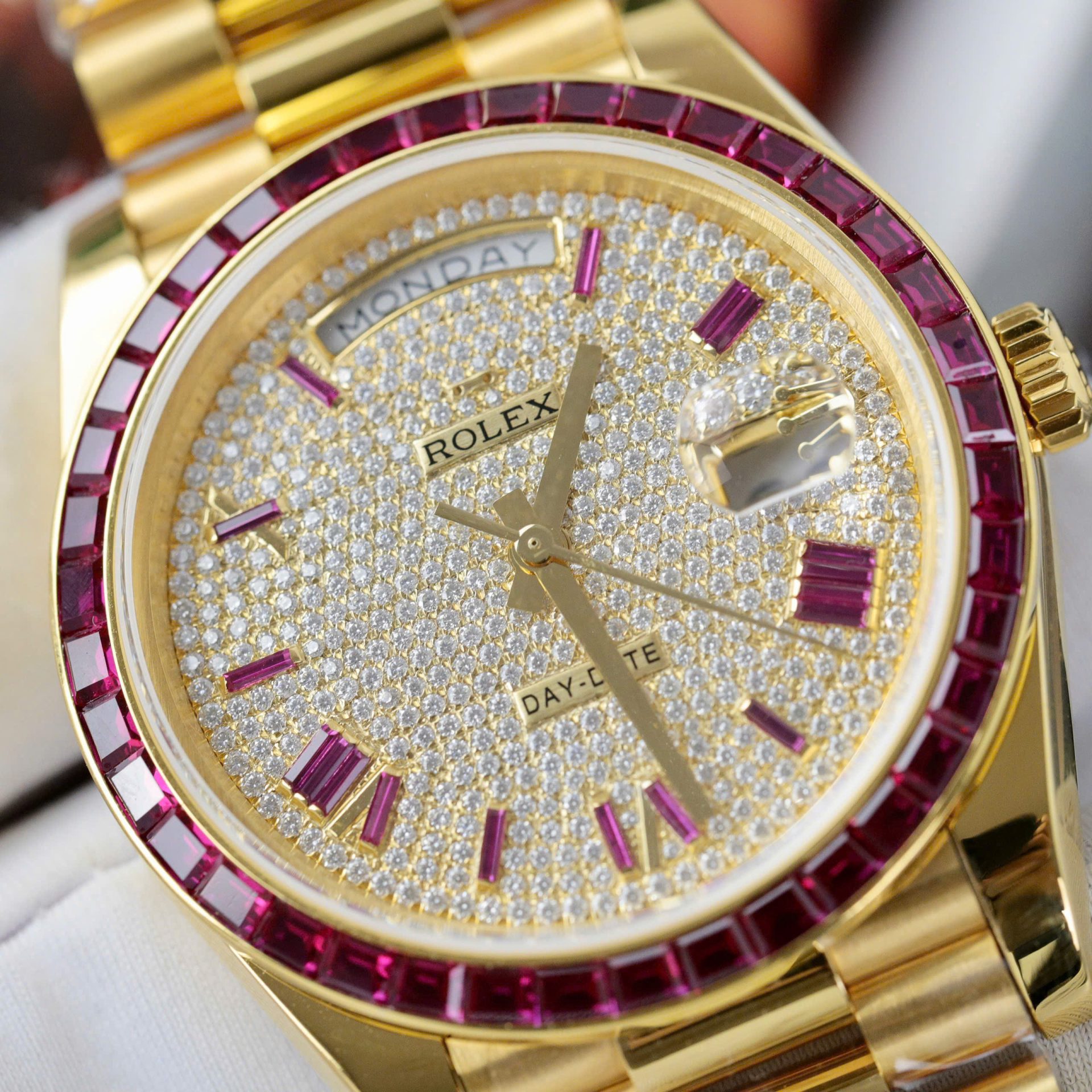 Đồng Hồ Rolex Day-Date Độ Ruby Đỏ + Kim Cương Moissanite Bọc Vàng Thật GMF 40mm đang có sẵn tại King Replica.