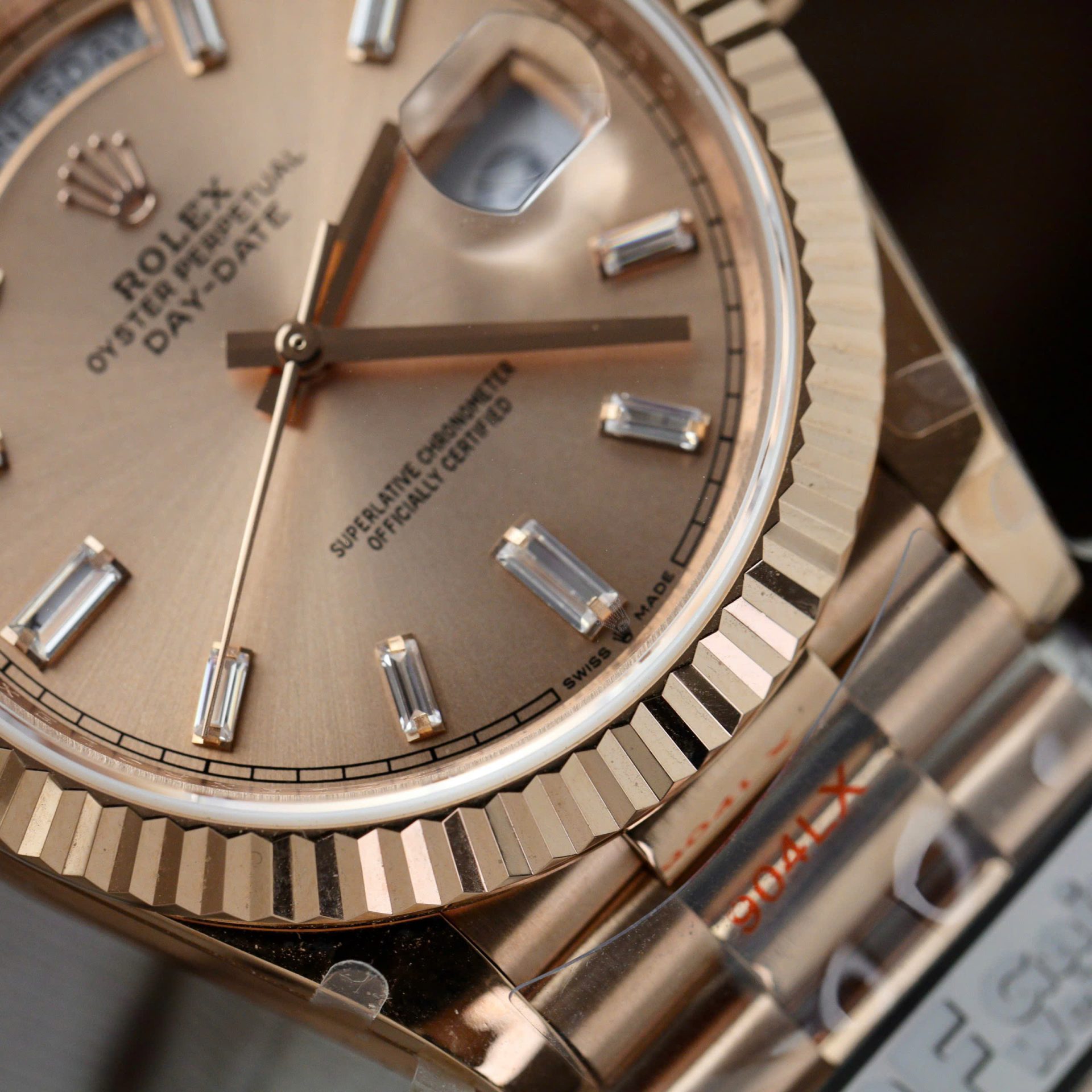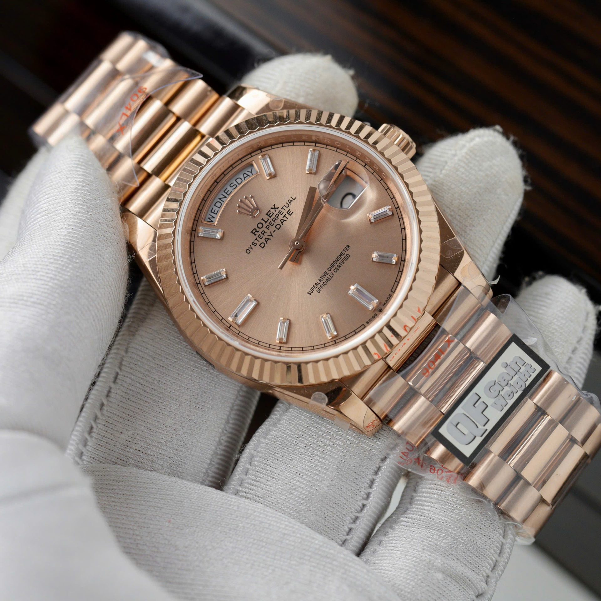 Đồng Hồ Rolex Day-Date Mặt Hồng Sundust Replica 11 Mạ Vàng Hồng Trọng Lượng 186 Grams QF 40mm