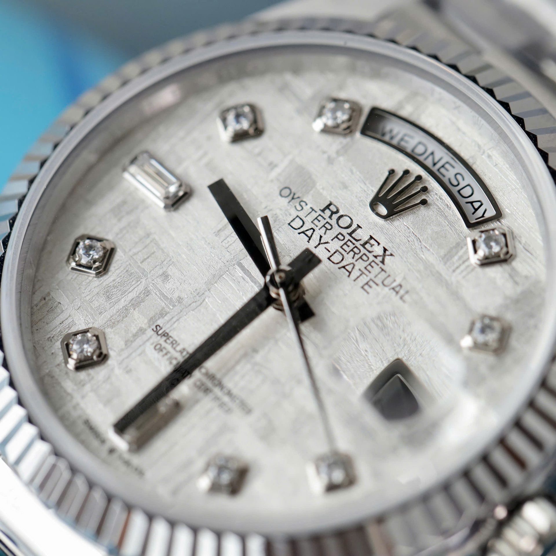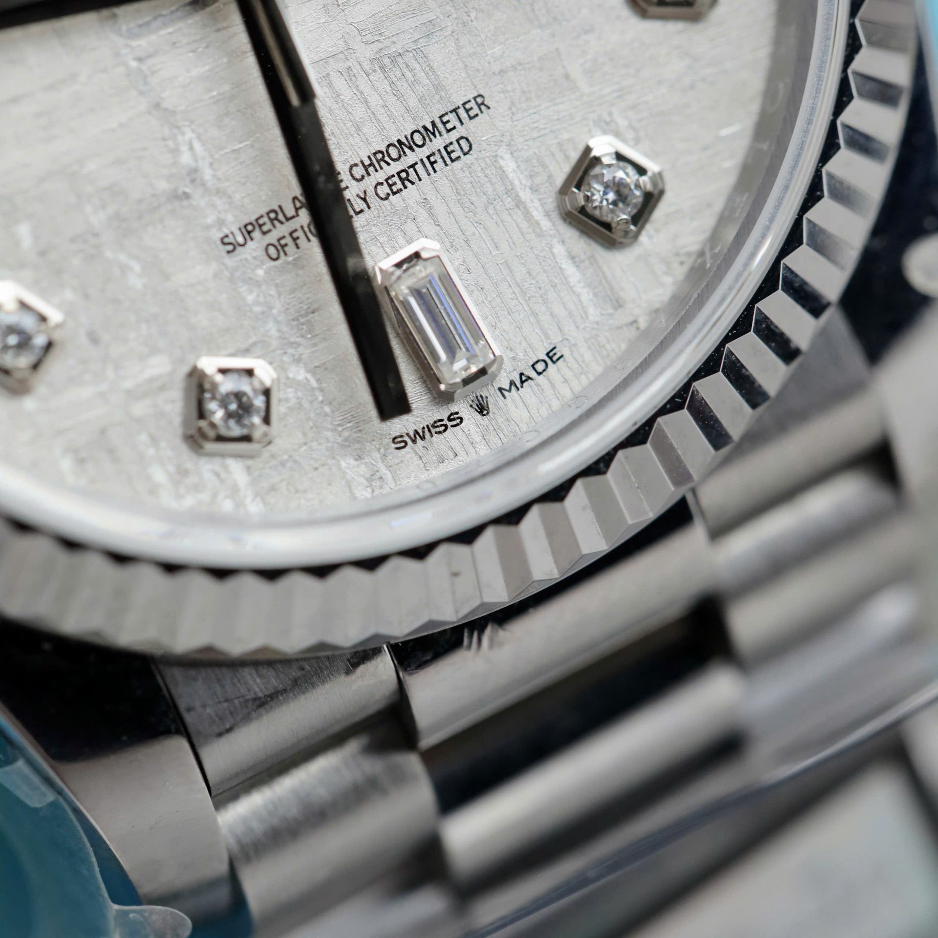 Đồng Hồ Rolex Day-Date Mặt Thiên Thạch Chế Tác Cọc Số Kim Cương Moissanite Xưởng QF 36mm