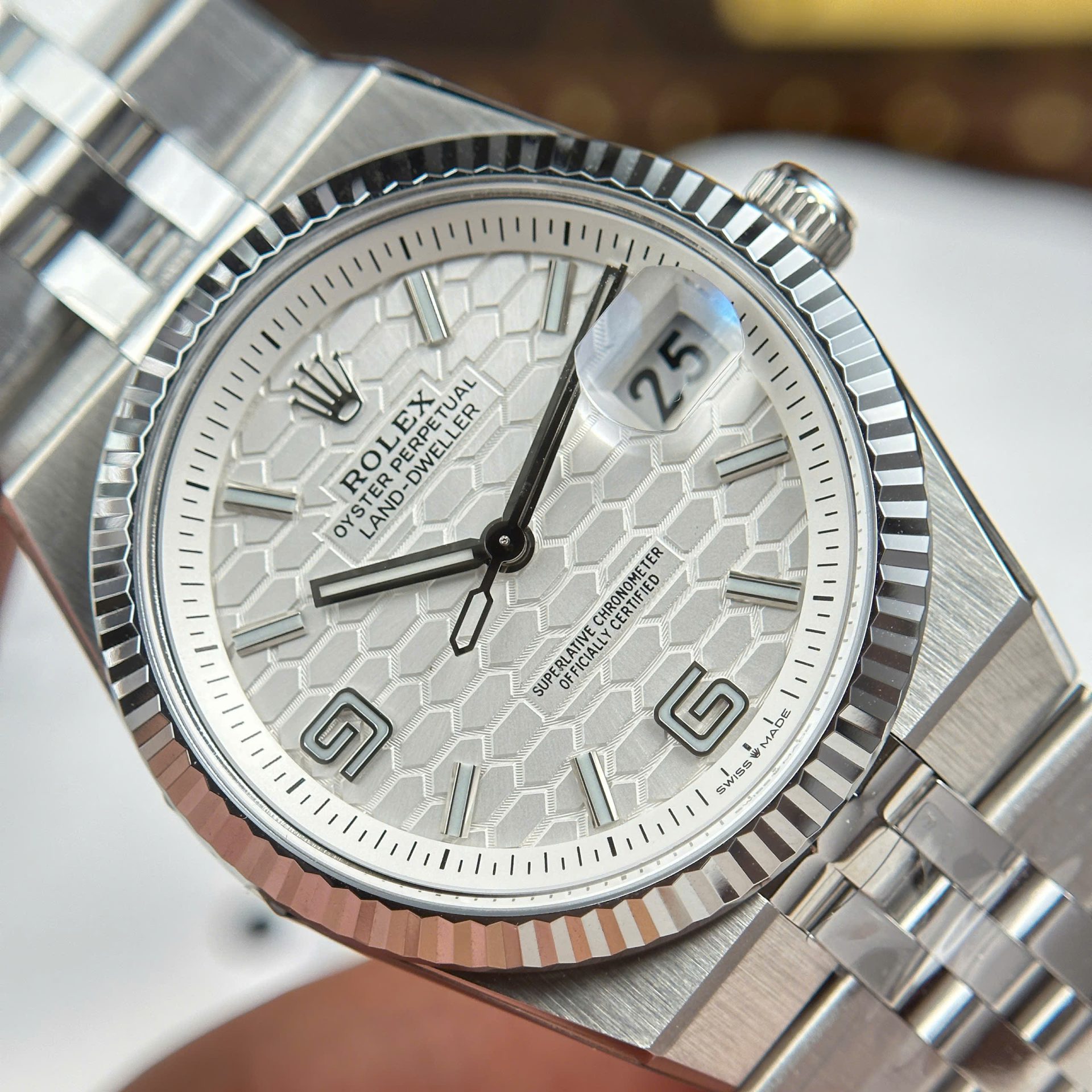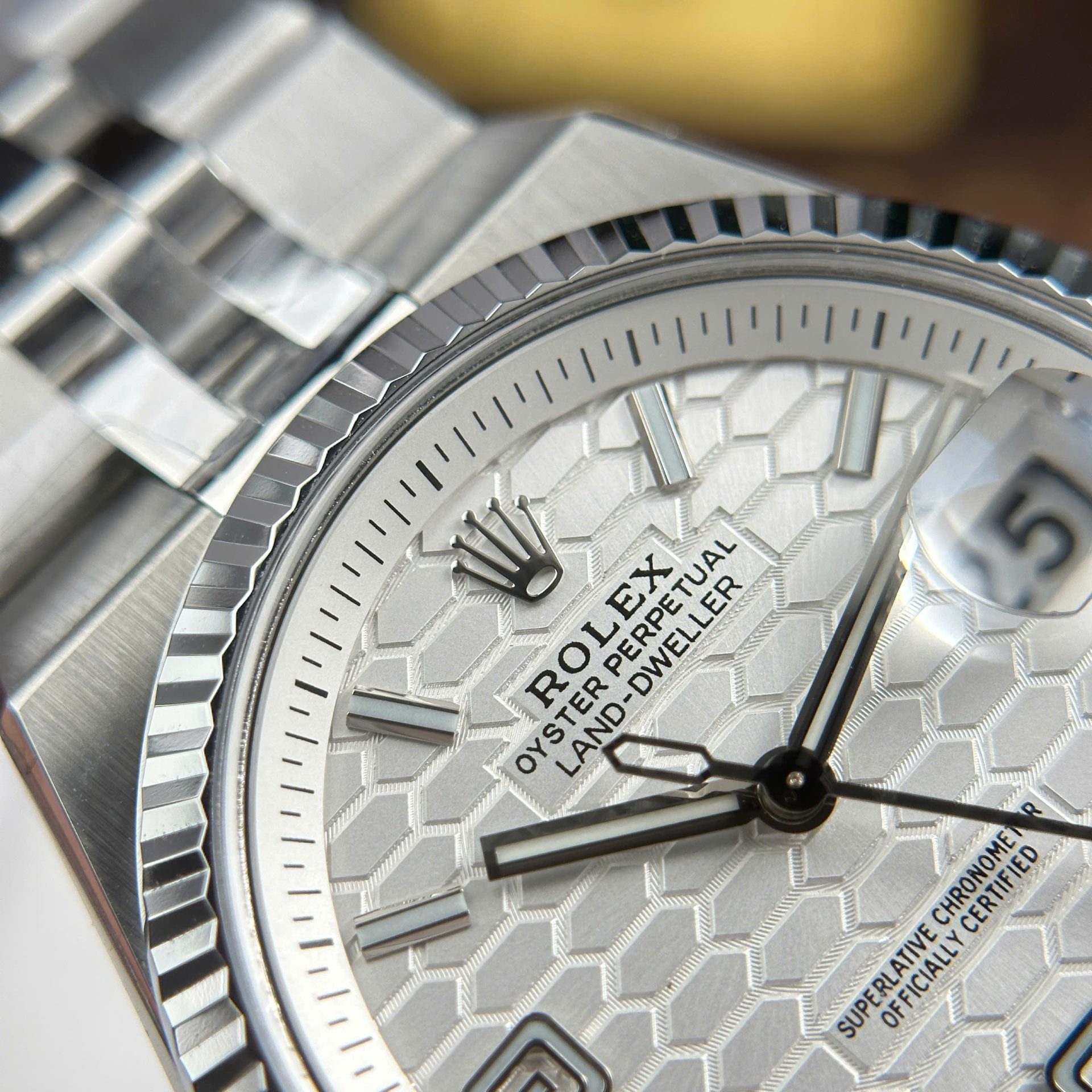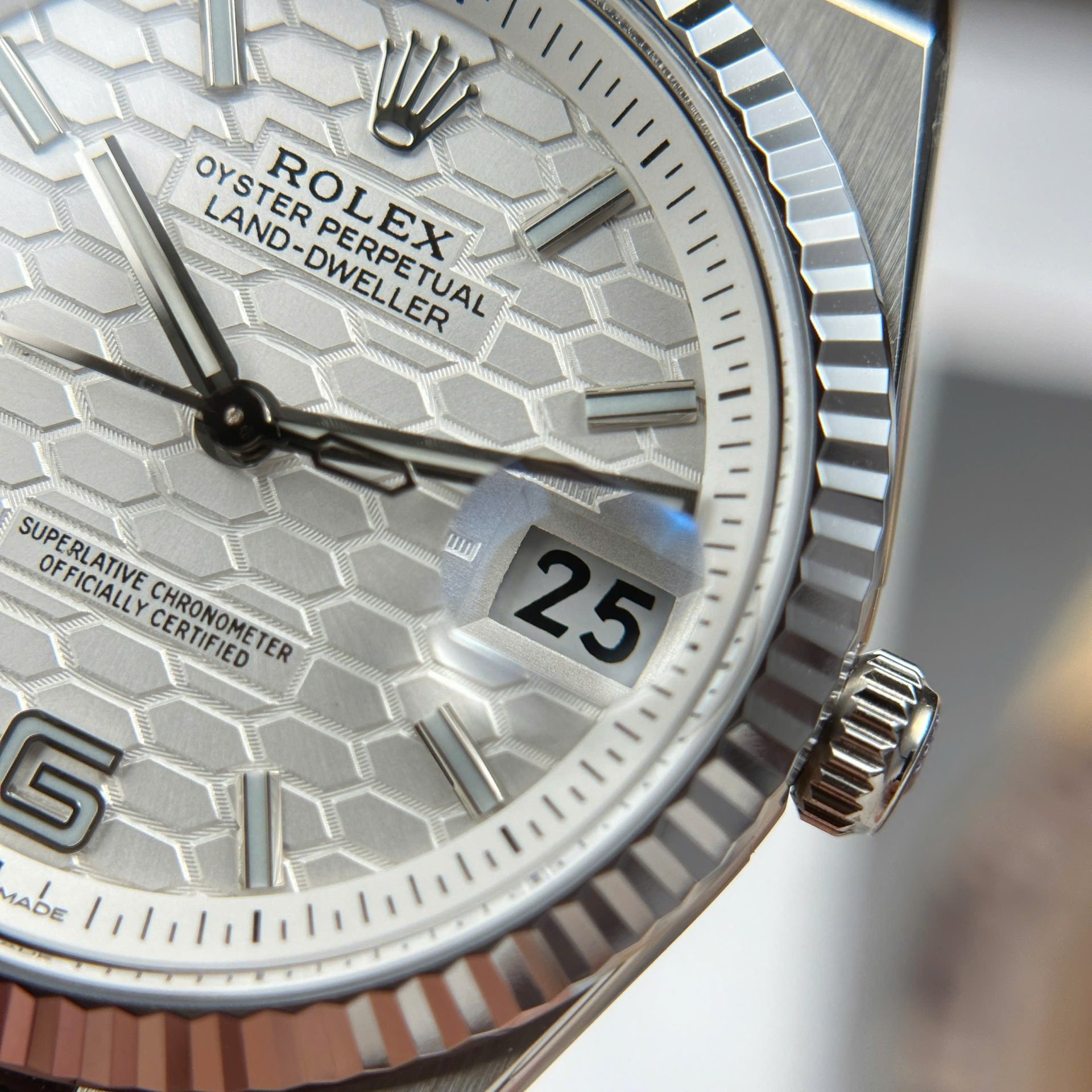 Đồng Hồ Rolex Land-Dweller 127234 Chế Tác Mặt Trắng Họa Tiết Tổ Ong 36mm