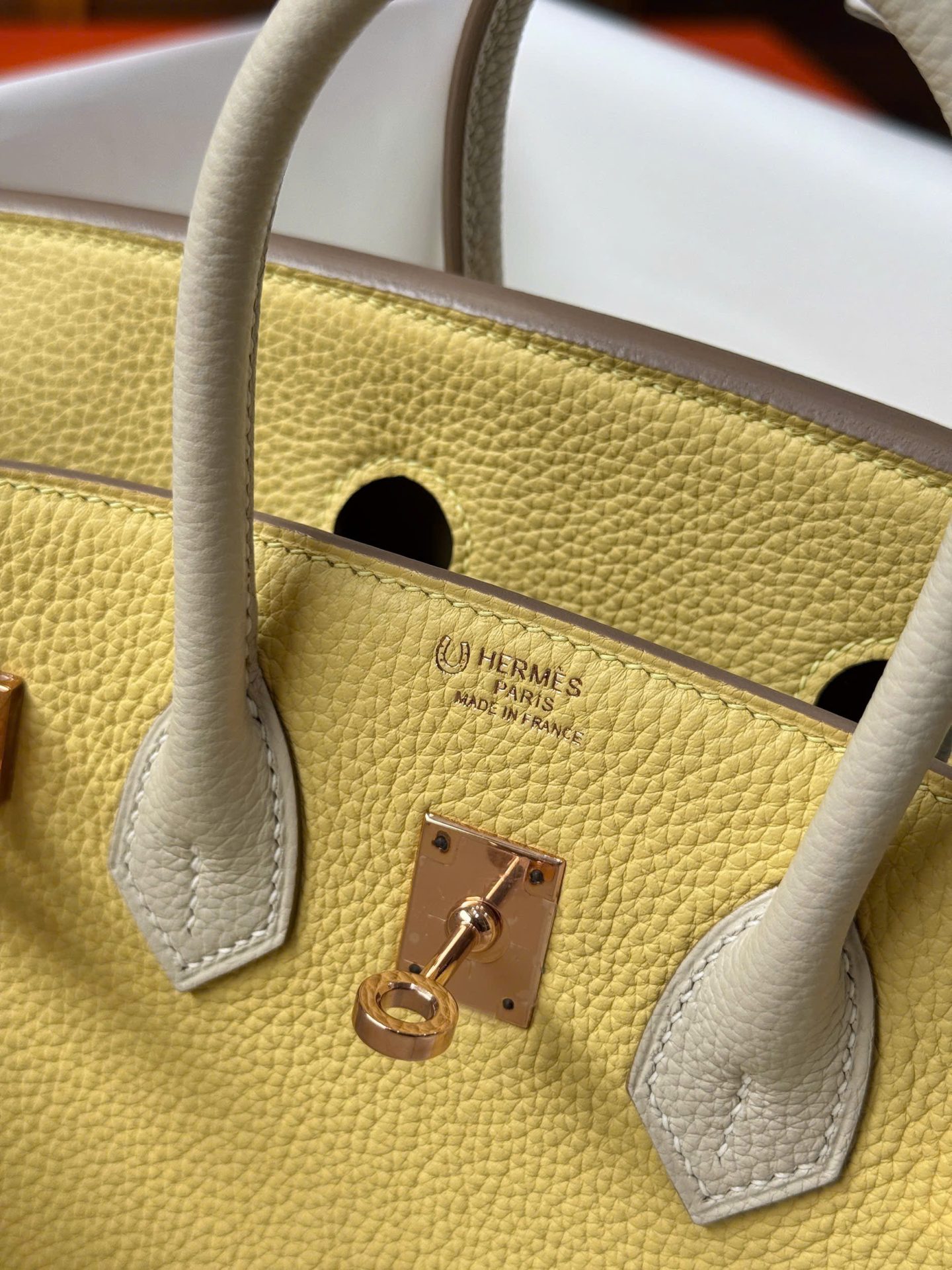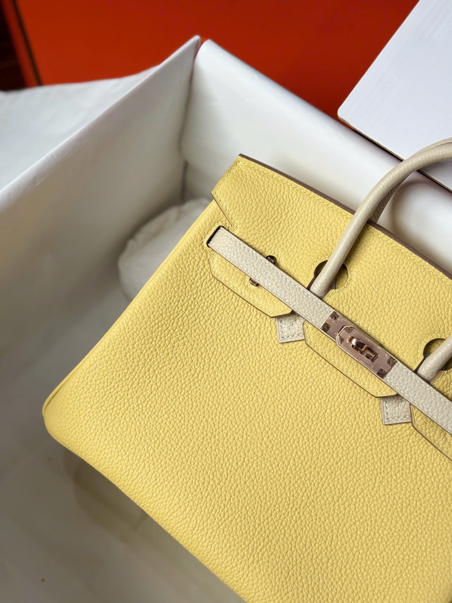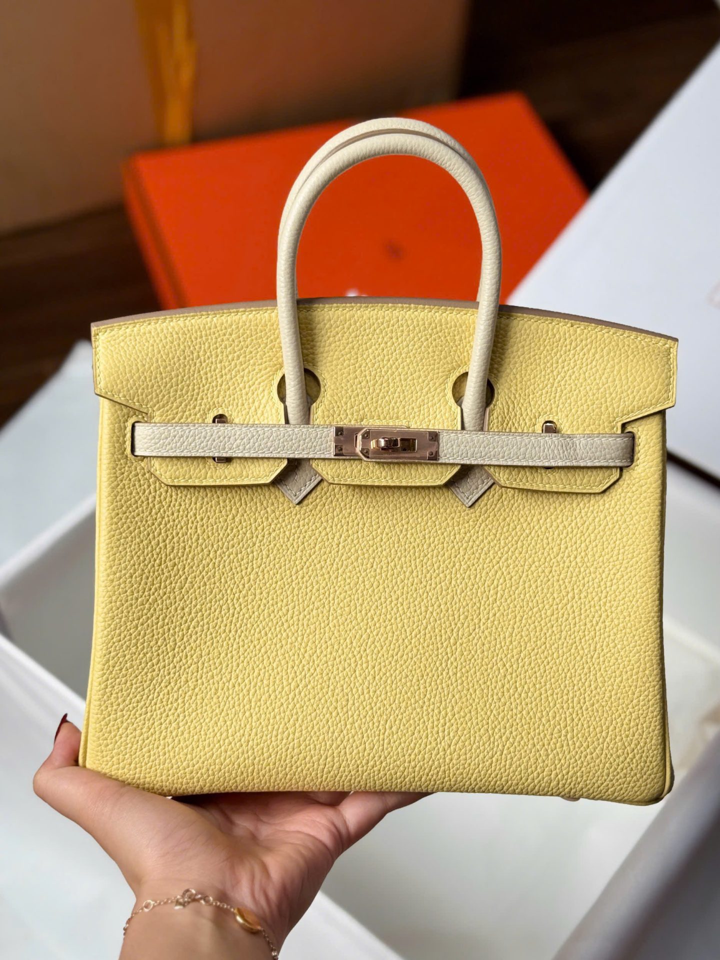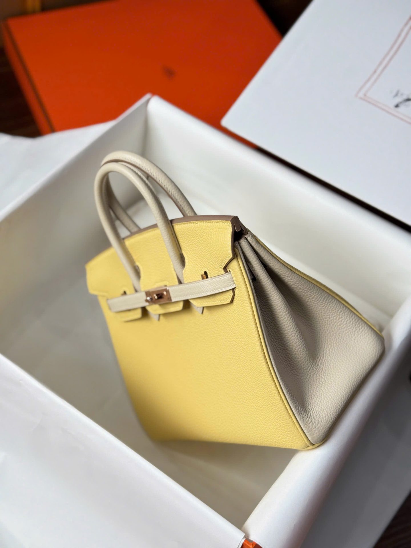 Hermes Birkin Handbag Near Authentic Yellow Color Rose Gold Lock 25cm
