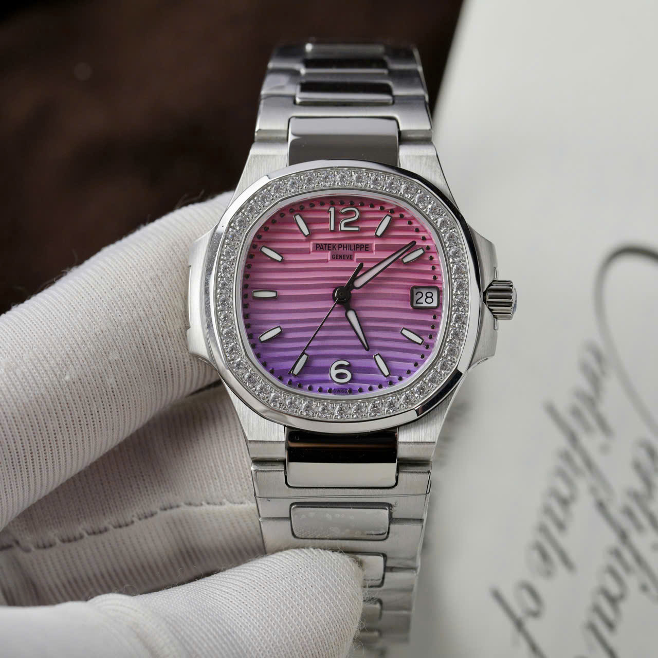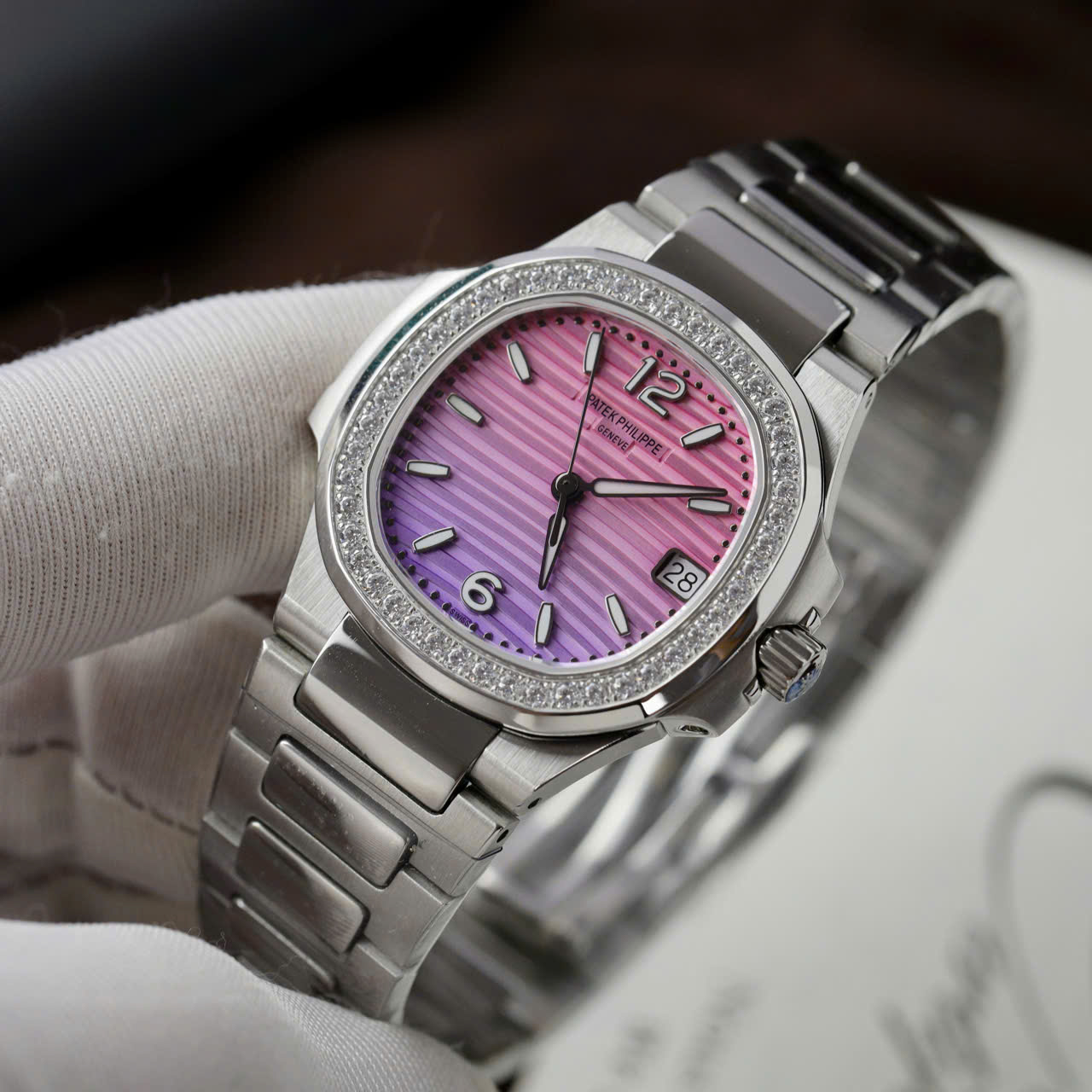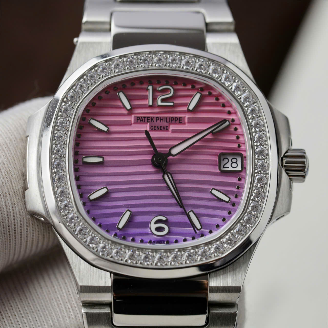 Patek Philippe Imitation Watches Nautilus 7010R Women Purple Pink Dial Bezel Diamonds CZ GR Factory 32mm